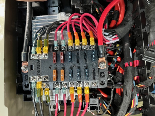 The MB DC Bus Bar was previously connected to the Blue Sea Distribution Box. The “AUX 1” 12 AWG wire in the passenger seat pedestal had been connected to an unfused #10 line in the Blue Sea distribution box. That connection was repurposed to feed the ignition-switched 12V line from the starter battery into the Victron 18A DC-DC charger, configured for LiFePO4. I did not go with the 30A or 50A Victron charger due to the use of 12 awg wire. A 30A fuse was used due to fact that I could not find a 25A AMI/MIDI fuse. According to an automotive wiring gauge table Tomm sent me, 30A requires 10 awg above 15' and I'm assuming the AUX 1 wire between the driver and passenger pedestals just a couple of feet apart is less than 15 feet. The LFP battery connects to the DC-DC charger, and the inverter is wired directly to the battery. The 120V AC to DC charger on the bottom of Figure 2 connects with an Anderson Power Connector. After putting everything together, I tested the different sub system voltages and verified everything worked.
